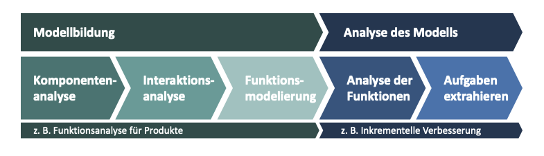 In einem ersten Teil (Modellbildung) versuchen wir die Wirklichkeit in ein Modell zu gießen mit den Schritten der Funktionsanalyse: Komponentenanalyse, (Interaktionsanalyse – nur Produkt) und Funktionsmodellierung. Das funktioniert mal besser und mal schlechter, meist abhängig vom System, das modelliert wird.