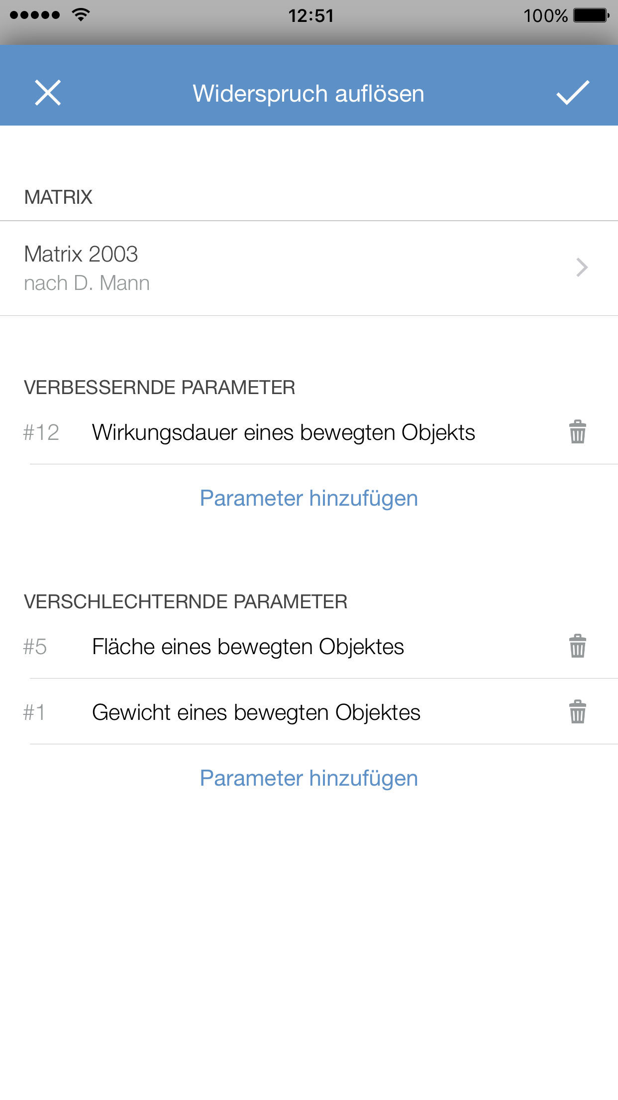 Mithilfe der neu hinzugefügten Matrix 2003 erhalten Sie noch mehr Lösungen für technische Widersprüche und erkennen Prinzipien und Beispiele einfacher als jemals zuvor. Neben der zusätzlichen englischen Lokalisierung haben wir unseren Fokus auf die intuitive Bedienung gelegt. Die Übersicht beim Erstellen eines Widerspruchs zeigt jetzt alle Informationen auf einen Blick und ermöglicht das schnelle Hinzufügen oder Entfernen von Parametern.