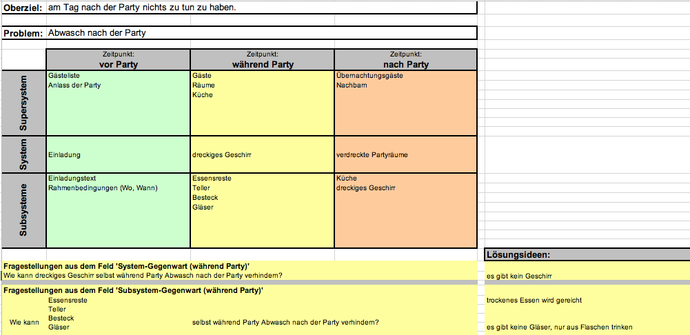 „Ich hab Ihre Tabelle etwas umgearbeitet und teilweise ergänzt. Wenn man die Felder für Supersystem, System und Subsysteme sowie Oberziel und Problem ausfüllt, werden die Zeilen unten automatisch bevölkert. Außerdem hab ich eine Spalte für Lösungen eingeführt, das finde ich ganz übersichtlich um zu sehen, zu welchen Punkten man schon Lösungen hat.“