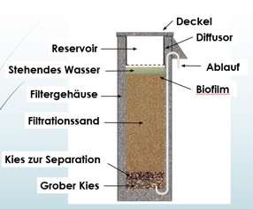 Das bringt mich dann auch zu meiner TRIZ-Aufgabe, die ich aus Kenia mitgebracht habe: Seit den ersten Filtern war der Diffusor ein Problem. Der Diffusor ist eine Lochplatte, die verhindern soll, dass das Wasser, welches in den Filter geschüttet wird, als ein harter Strahl auf die stehende Wasserschicht trifft und dadurch die darunterliegende Sandschicht sehr stark aufwühlt. In dieser ersten Sandschicht bildet sich nämlich der Biofilm aus: Eine Schicht, in der aerobe Bakterien leben, die die schädlichen Keime und Bakterien im Wasser vernichten. Diese Schicht soll möglichst ungestört bleiben.